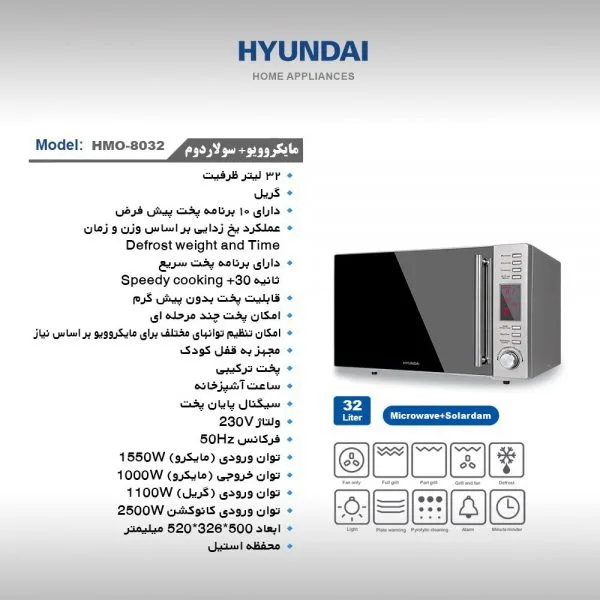 اگر به دنبال یک مایکروویو حرفهای و قدرتمند برای آشپزخانهتان هستید، مایکروویو هیوندای مدل HMO-8032 انتخابی ایدهآل است. این دستگاه با ظرفیت ۳۲ لیتر و توان ۲۵۰۰ وات ترکیبی، امکانات متنوعی برای پخت، گریل، یخزدایی و گرمکردن سریع غذا دارد.